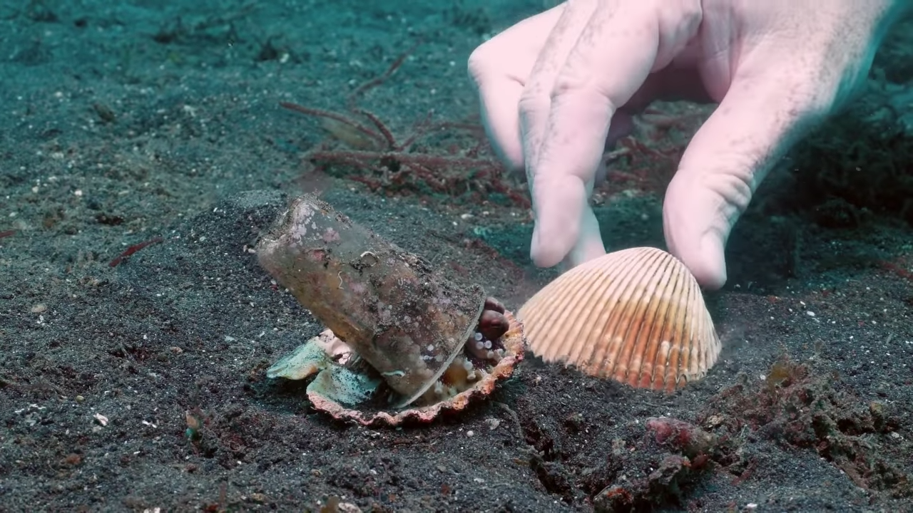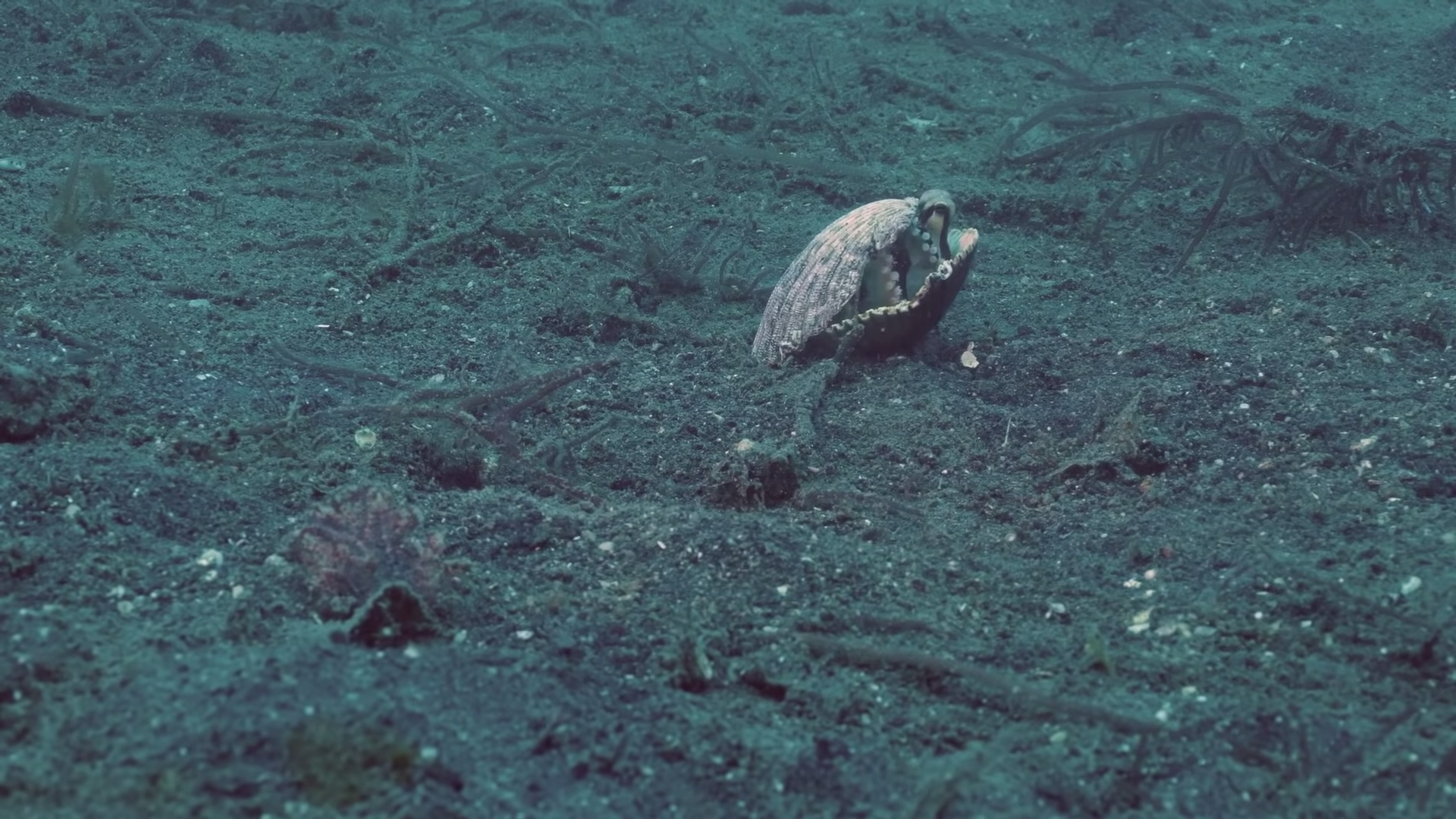 ▼團隊見到這個情形,便決定充當「房仲」,為小章魚推薦適合的「物件」-各式各樣的貝殼,讓小章魚挑選。他們分成兩批人馬,一群人四處探索海床、尋找貝殼,只留下其中一些人留下來照看小章魚。