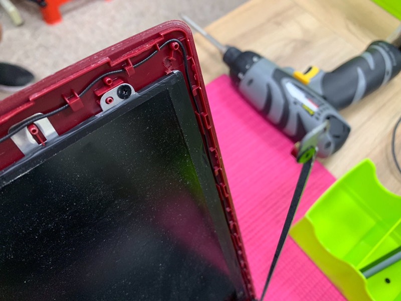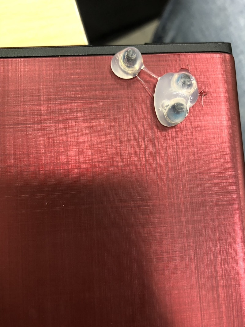 ▼可以看到外殼的右上角被鑽了好幾個洞,上面還有外露的螺絲帽和乾掉的膠水,令人哭笑不得。