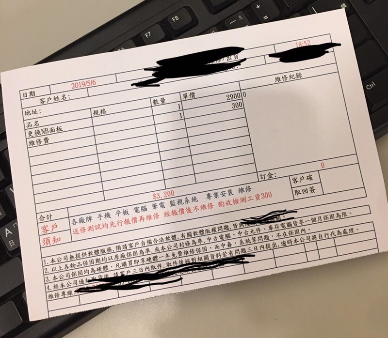 ▼老闆的解釋是「拆開電腦時兩人都不在現場,無法證明是老闆用壞還是本來就已經壞掉,加上考慮到客人是學生,一般上不會願意負擔最少2000元的換殼費,於是選擇了最便宜的處理方式。」事後原po和朋友查看單據時才發現,原來在電腦上鑽洞竟然還必須要多付300元的「維修費」!