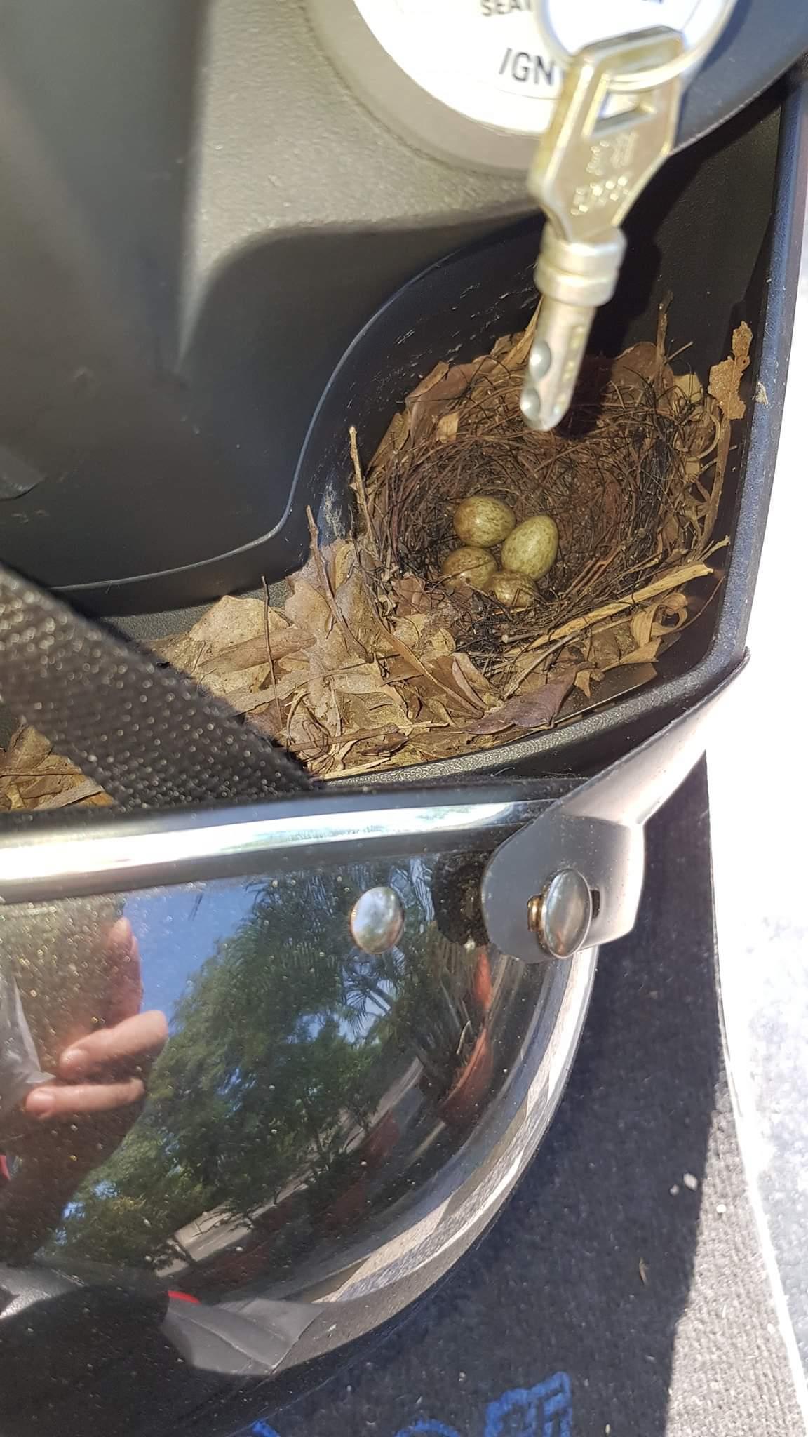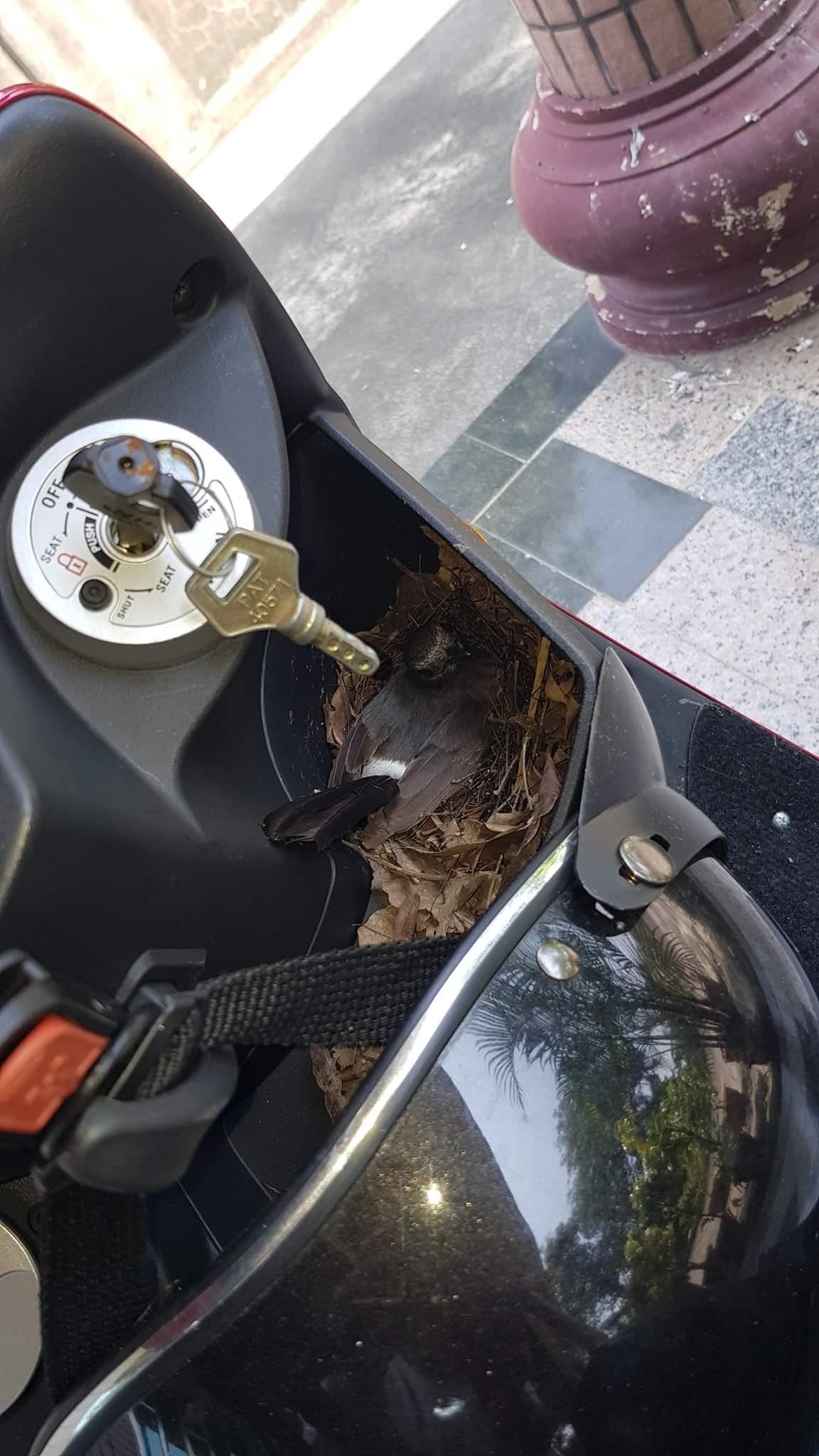 2019年05月16日住家附近通常會看到鳥類在陽台或是騎樓築巢,但是在機車裡的應該沒看過吧?台南一名網友就在「爆怨公社」上傳照片,表示自己才一個多星期沒有騎機車,竟然在牽車時看到置物槽被鳥媽媽霸佔,而且還有蛋!
