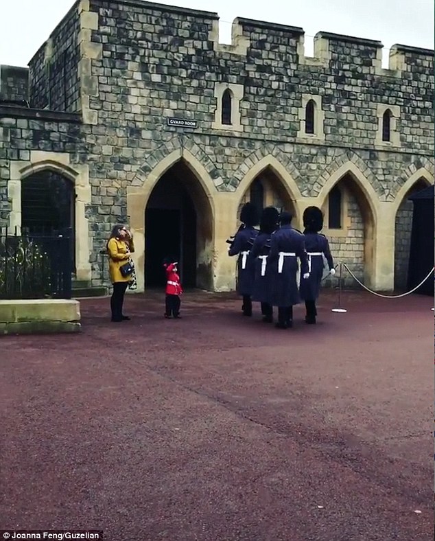 ▼Marshall穿上制服、戴上帽子,全副武裝化身「迷你衛兵」,來到溫莎城堡門口,等待衛兵們回來。