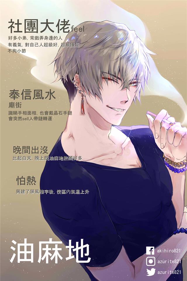 ▼特色:社團大佬,講義氣,對身邊的人很好,護短,不拘小節。他信奉風水,怕熱,習慣晚間出沒。