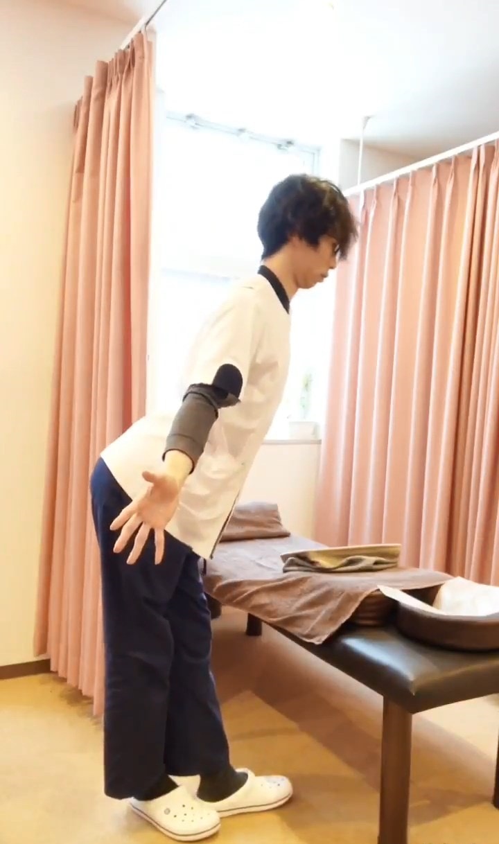 ▼首先用前後腳的方式站好,將手掌向前方張開,慢慢向前做出鞠躬的動作。