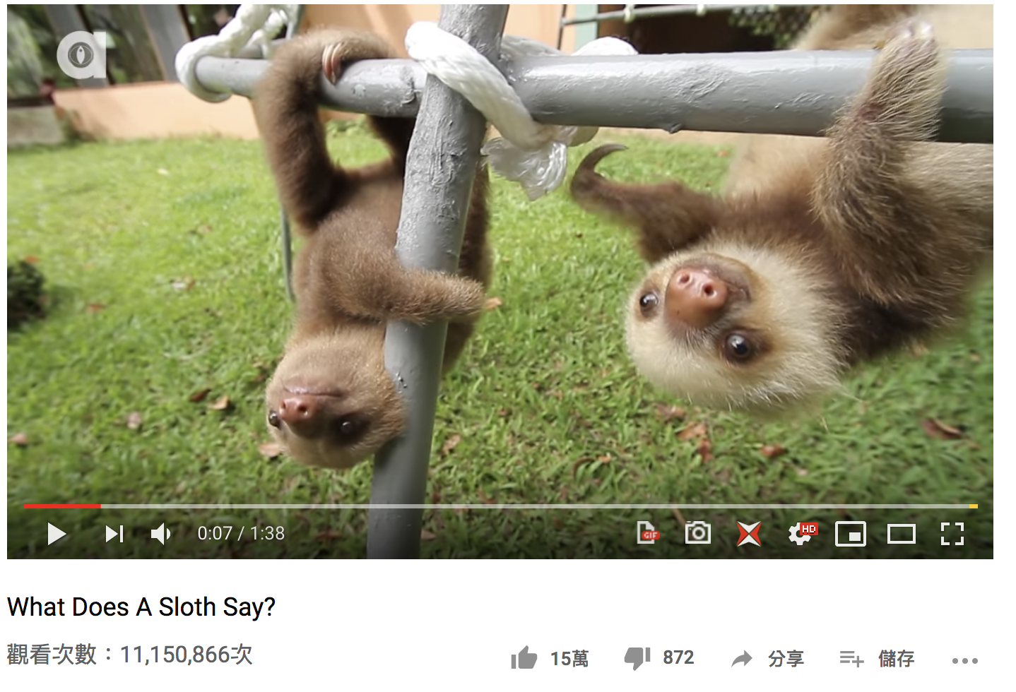 ▼Youtube上一支記錄著樹懶的叫聲的影片,因為實在太可愛,已經吸引了15萬人按讚,突破千萬點閱次數。