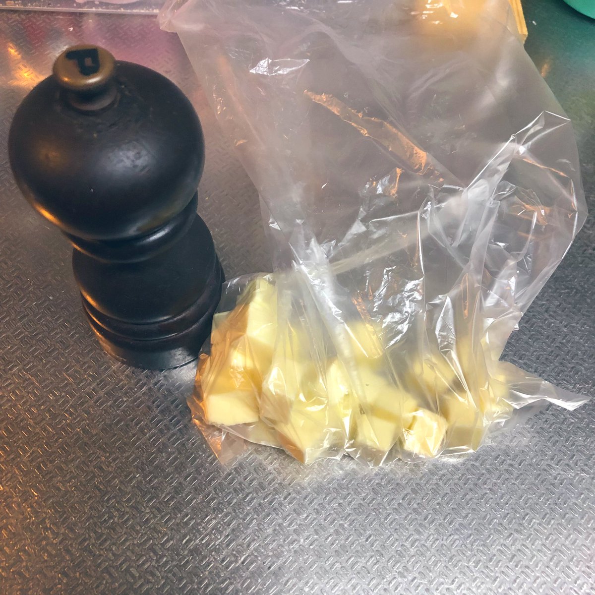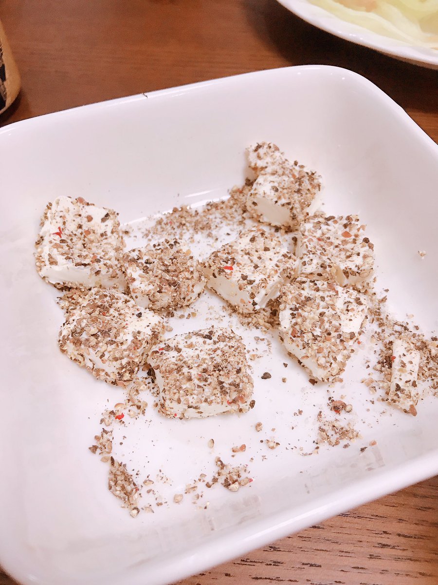 ▼把起司放進塑膠袋。接下來這一步很重要,要筆記起來:加入「大量」的粗磨黑胡椒粉。至於要多大量呢?原po說要多到讓人覺得「簡直是瘋了」的程度。