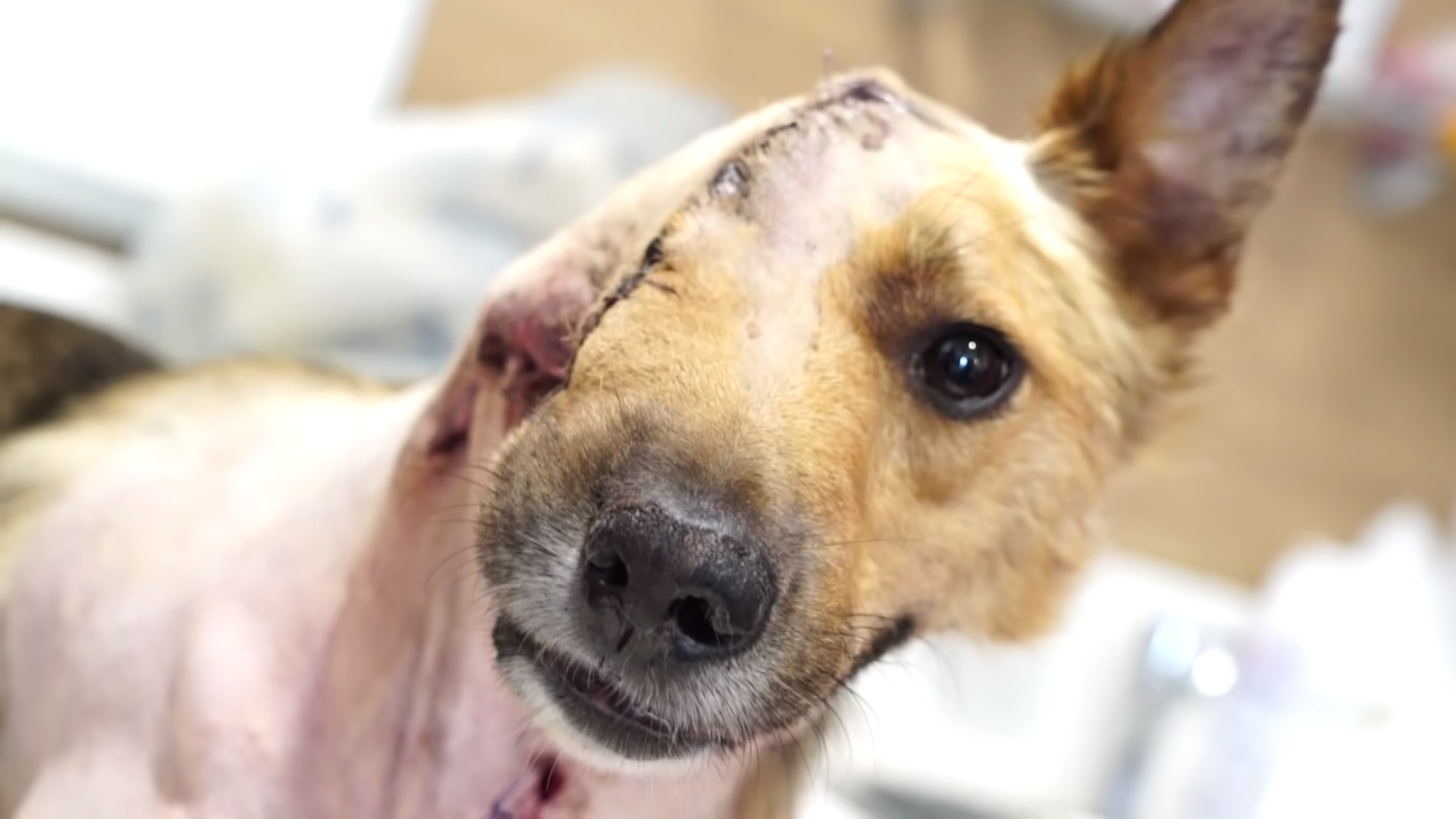2019年05月17日當牠一轉頭,看到的小孩一定會嚇哭。這隻只剩下半邊臉的狗狗名字叫Sky,幾年前還在流浪街頭的Sky,被人用鐵鍬重擊,砍掉半邊臉,導致右眼、右耳以及顴弓全部掉落,右臉垂掛廢棄組織,甚至有牙齒外露,受創的Sky找了一個地方躲起來,被一名路人發現,當時Sky空洞的眼窩全都是毛髮和雜草,模樣非常嚇人。