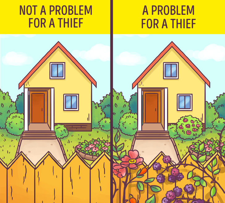大家可以在窗戶或其他容易被闖入的地方種一些玫瑰之類的有刺植物,讓竊賊在闖空門時增加難度。