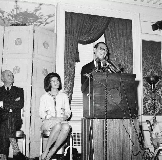▼1964年12月13日,貝聿銘和賈桂琳甘乃迺出席新聞發布會,宣布甘乃迺圖書館修建基金已達到1000萬美元。