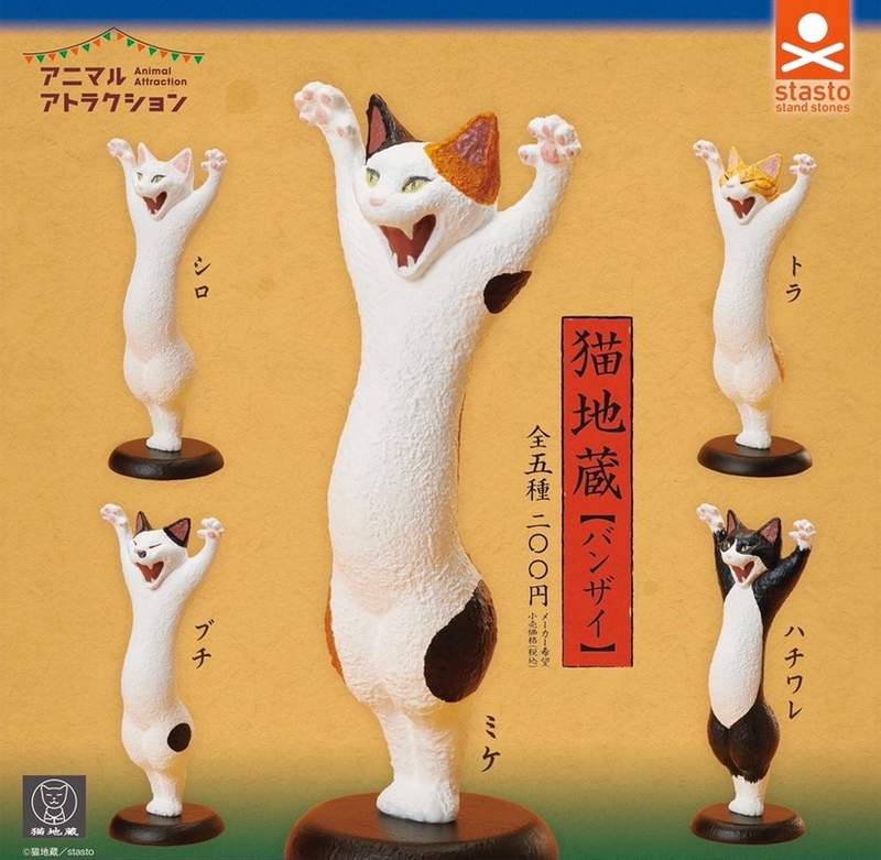 ▼在猫地蔵扭蛋化之前,stasto有出過一款「萬歲貓」(バンザイ猫),手舉高高的樣子,有點蠢萌呢~