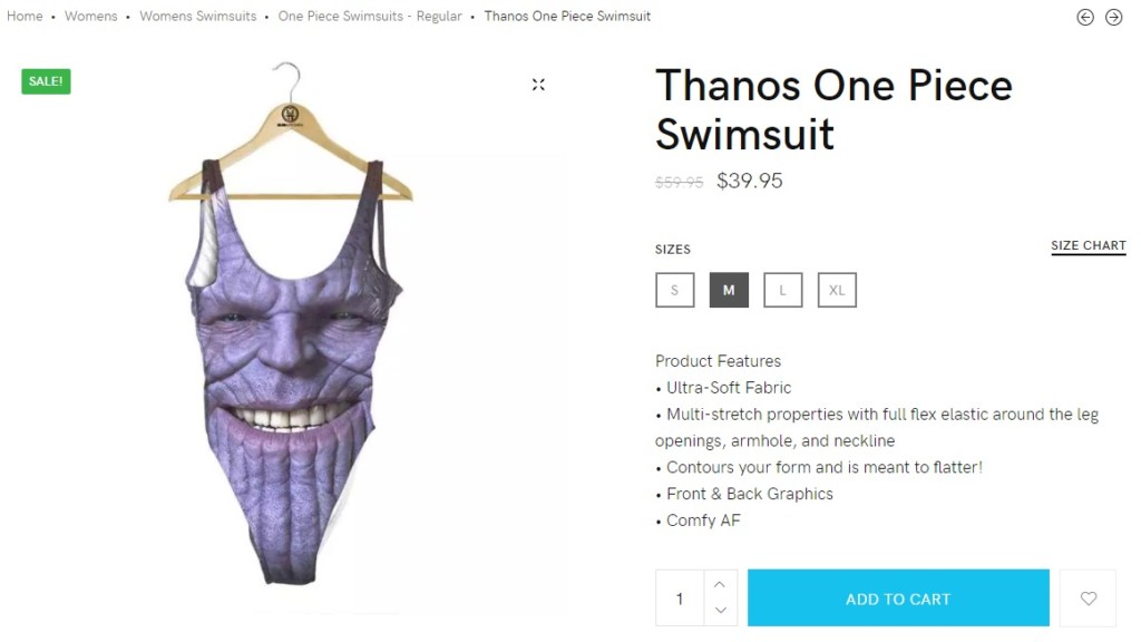 ▼而來自美國加州的服裝品牌「Beloved Shirts」,就趁著這一股熱潮,在網站上推出了一款直接將薩諾斯燦笑的模樣印在泳裝上的「薩諾斯連身泳裝」!