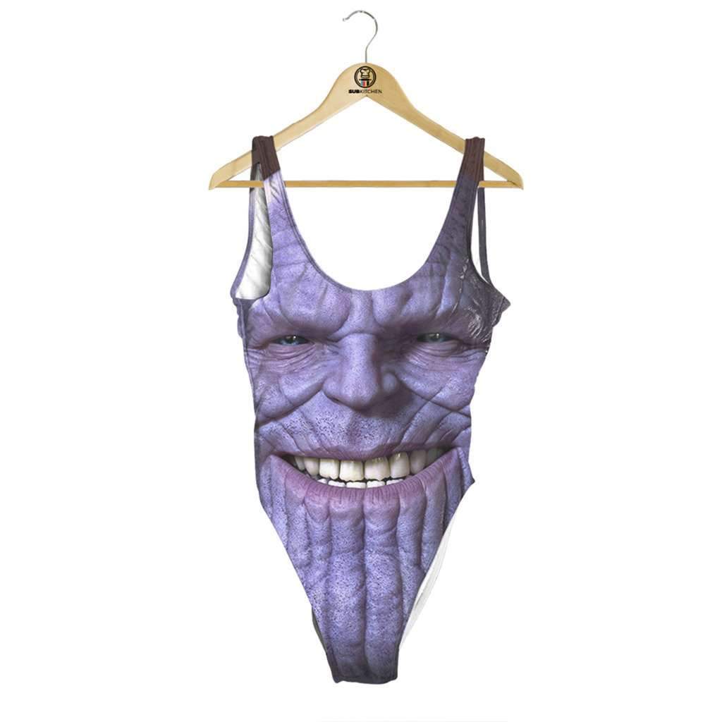 ▼而這套紫色的泳裝,薩諾斯的眼睛位於胸部的位置,潔白的牙齒在腰部的部分,而最令人尷尬的就是泳裝的下巴部分了!有網友將這件泳裝用 PS修圖的方式穿到了薩諾斯的身上,只能說這個視覺效果非常驚悚!