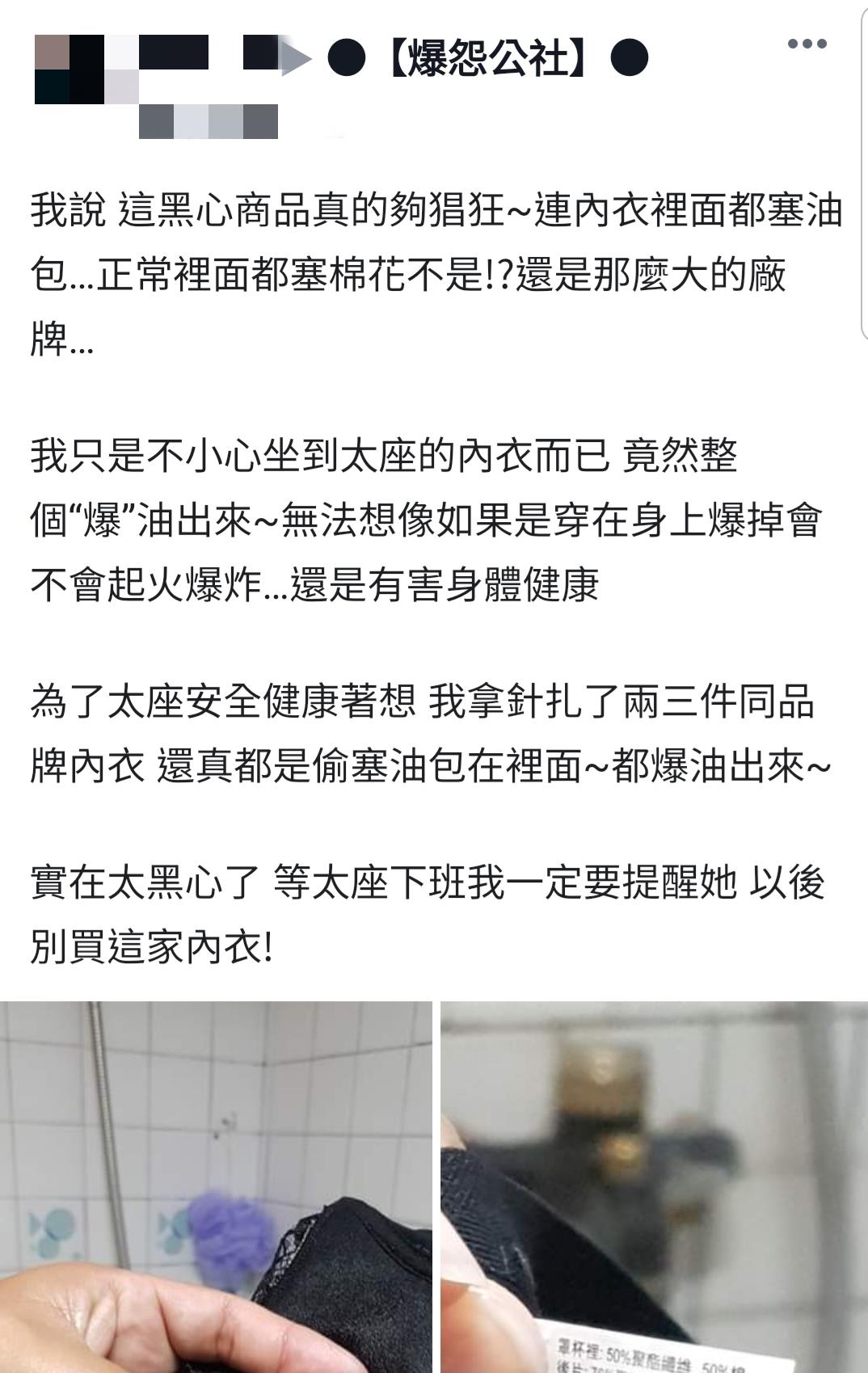 ▼原PO表示自己不小心坐到老婆的內衣,沒想到下一秒就發現噴油,身體也被噴到,當時心裡第一個想法就是「這黑心商品真的夠猖狂!」