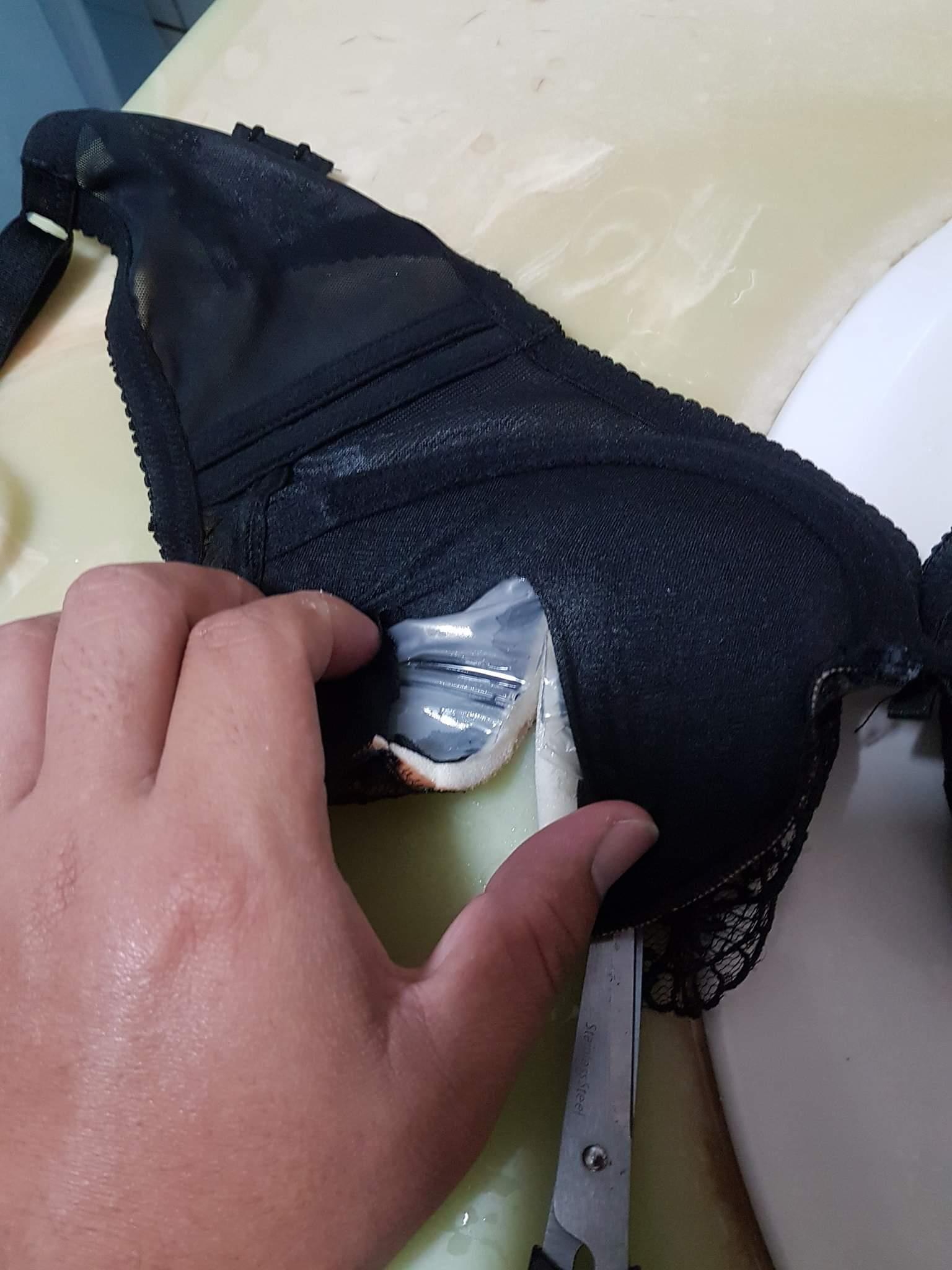 ▼結果當他把內衣都戳破,發現裡面真的都是相同情況,都是有裝滿液體的透明袋子!不知道真相的他,還自以為很貼心地說「等太座下班我一定要提醒她,以後別買這家內衣!」