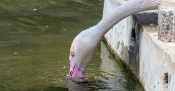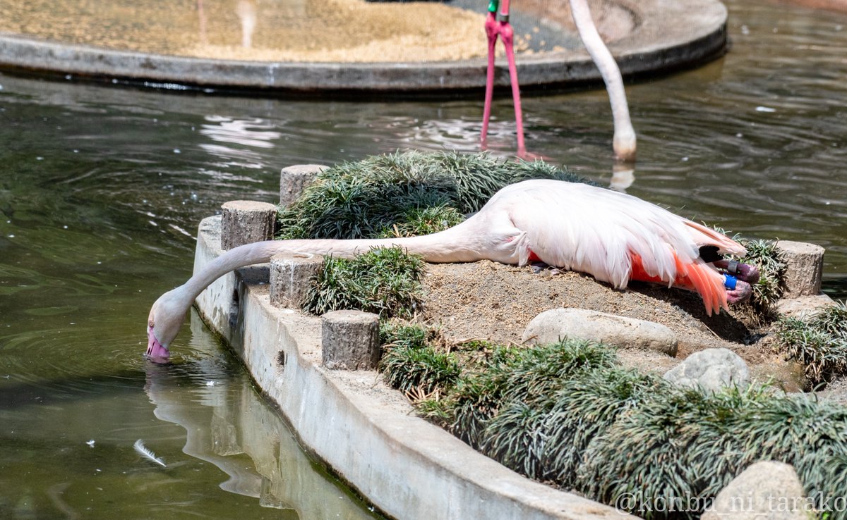 ▼2019年5月日本一名網友@konbu_ni_tarako在推特上發文,表示在多摩動物公園裡看到一隻喝水姿勢超獵奇的紅鶴。通常紅鶴喝水都是這樣的,就是低下頭去喝。