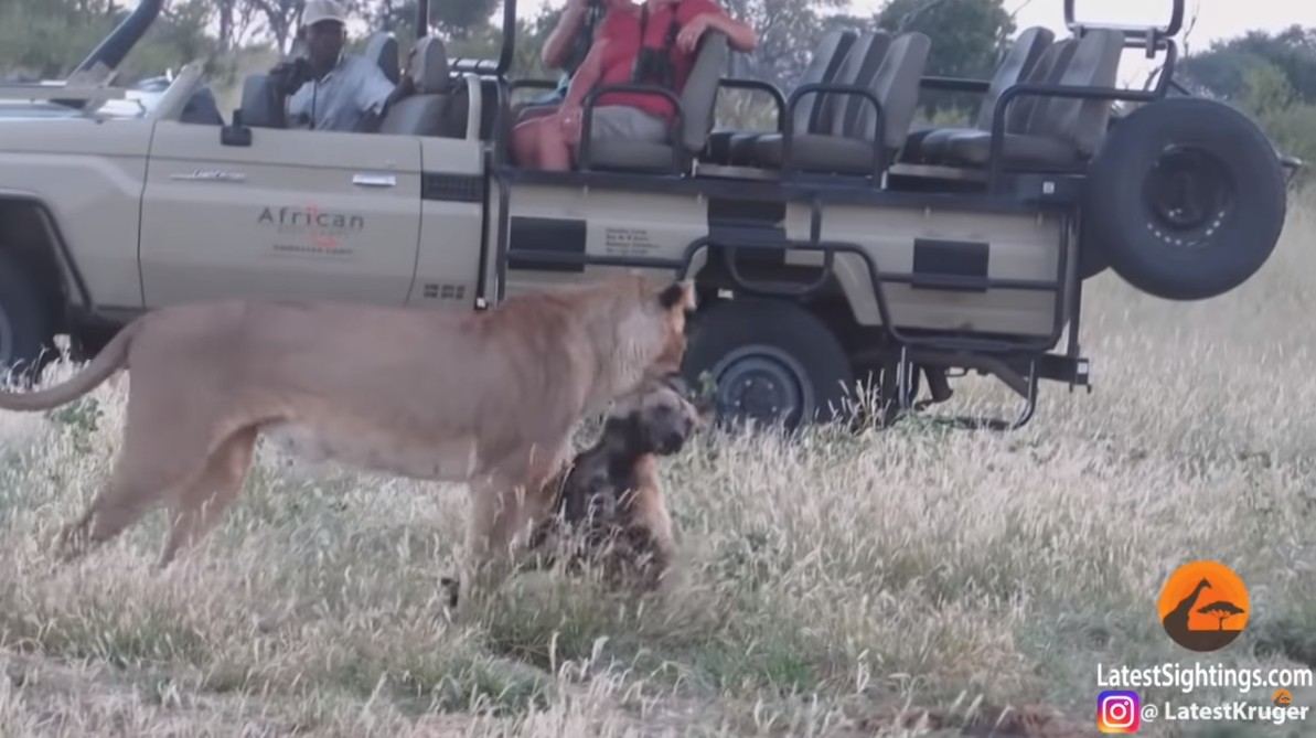 2019年05月29日日前在非洲南部辛巴威的萬基國家公園(Hwange National Park)中發生了一件令人大開眼界的大自然「鬥智」畫面,這隻非洲野犬在被母獅咬著時,竟然假裝不再掙扎,等到母獅鬆懈後瞬間逃命,讓剛好目睹這一切的遊客們都被嚇得目瞪口呆!