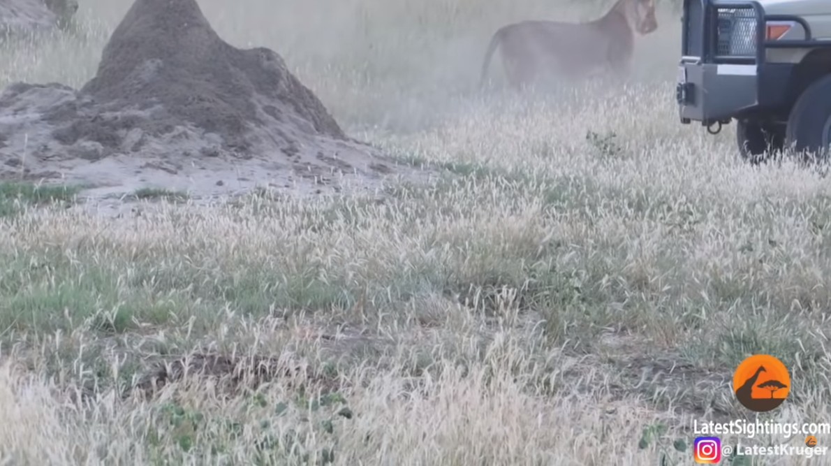 ▼事發當時,49歲的導遊 Calvet 正帶領遊客在萬基國家公園內遊覽,剛好遇到一隻叼著非洲野犬的母獅。