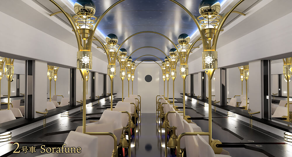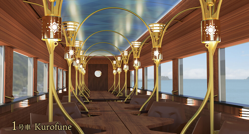 ▼車廂中的裝潢,也分為復古木造風與近未來銀白材質兩種,融合和風與洋風,車外有太陽與月亮,車頂還有星空設計,彷彿行駛在銀河的時光列車;特別的是,不同於一般的列車座位都是面向車頭或車尾以增加載客量,這輛觀光列車的位置都面向窗外,讓遊客可以好好欣賞沿途風景。