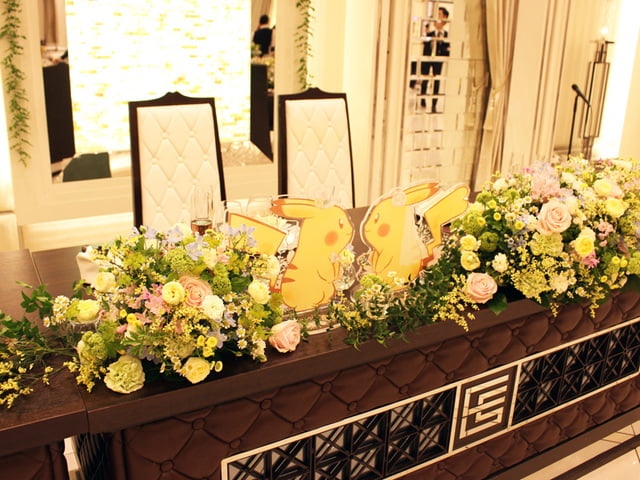 ▼先來看看婚禮現場的佈置,皮卡丘新郎新娘板很有愛,頭上還有禮帽和蝴蝶結呢。