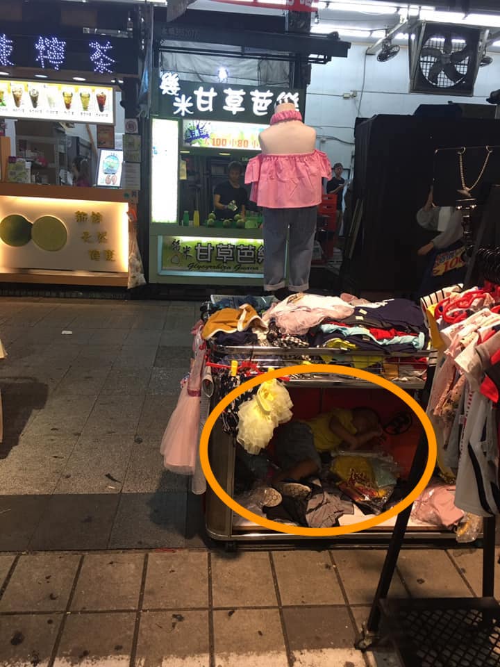 ▼但很快就有眼尖的網友發現,竟然有小孩子睡在賣衣服的攤子下面!