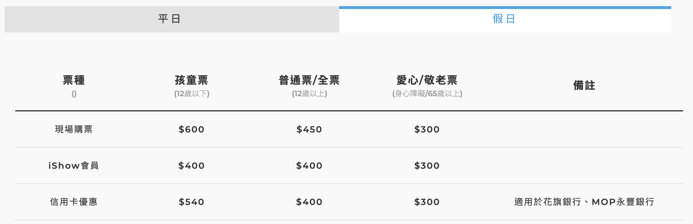 ▼現場購買原價票價,平日最低250元即可入場,假日則需要300元,票種分為愛心票、全票與孩童票,整體價格介於250元至600元。