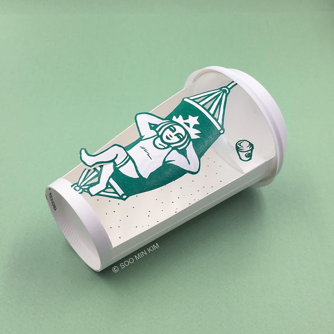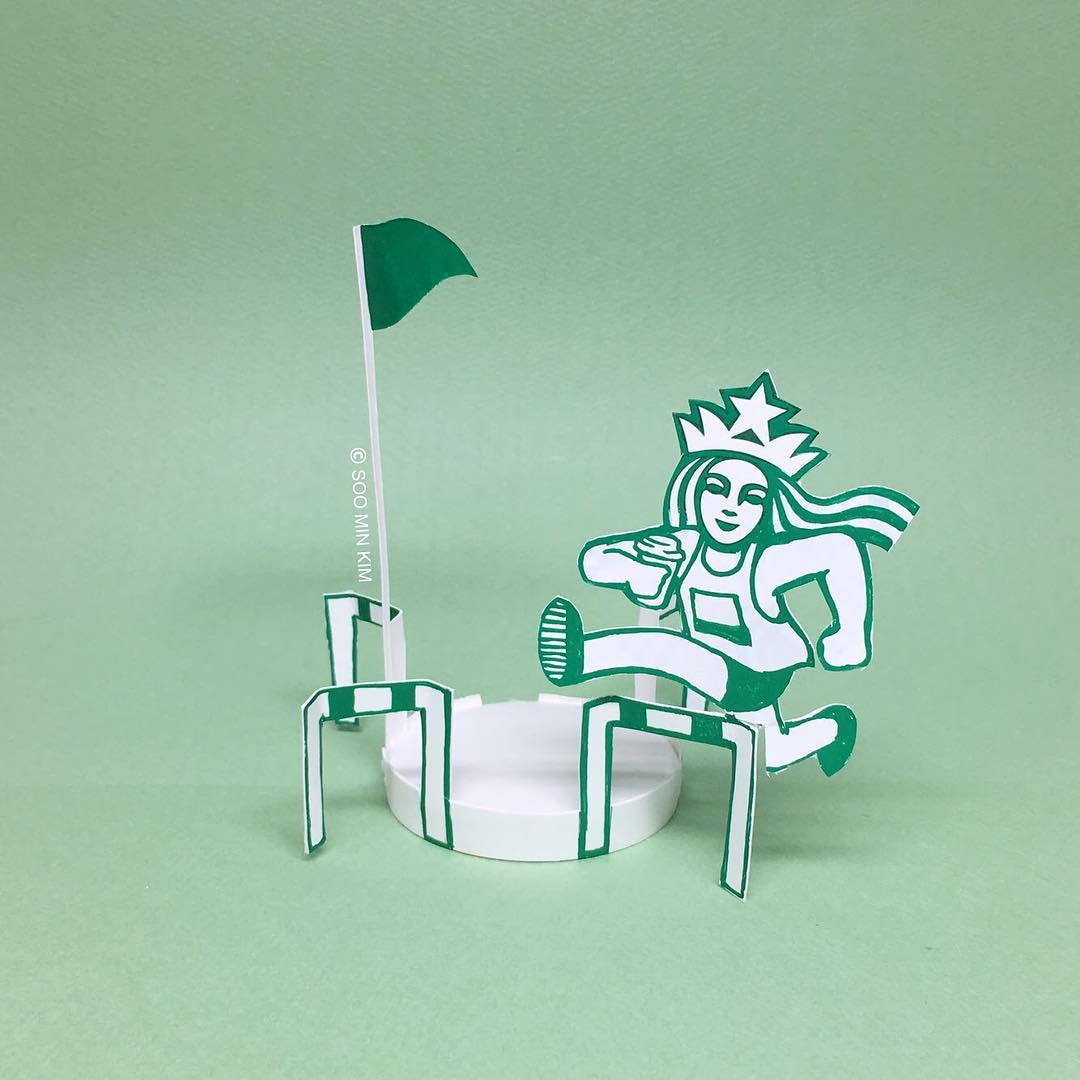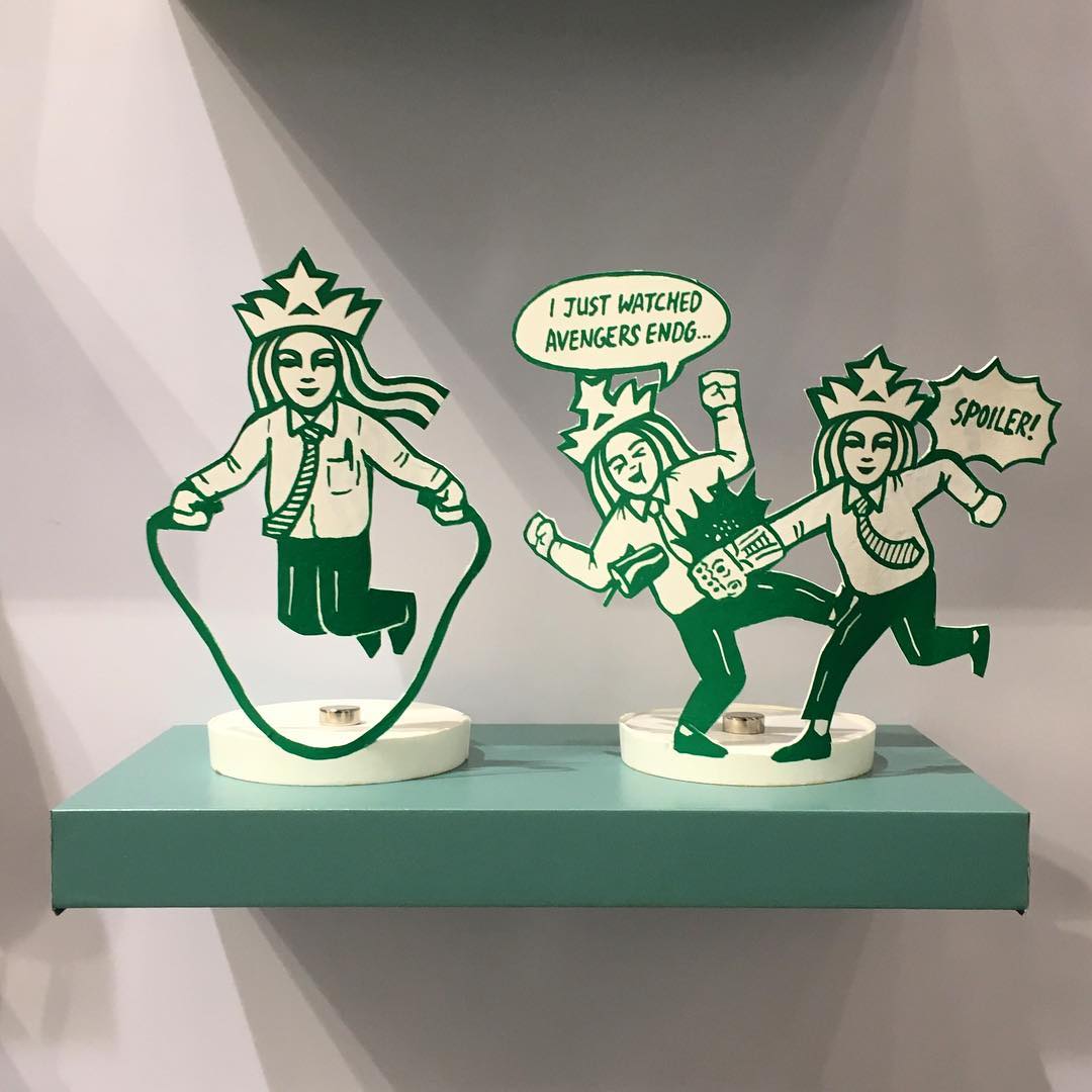 ▼韓國畫家Soo Min Kim會在星巴克的標誌上塗上一層白色顏料,接著使用綠色畫筆加工成不同模樣。變得生活化的美人魚,真的很有趣呢!