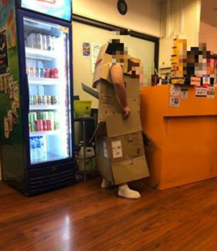 ▼沒想到一看到對方時,發現他又再身上添加多一個紙箱了!原來他是希望連制服短褲也掩飾起來,讓人完全無法發現他穿校服。