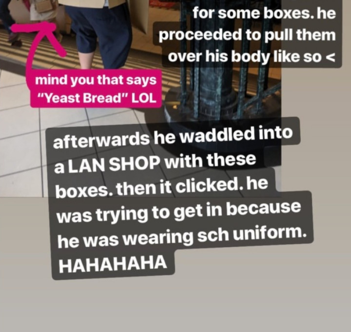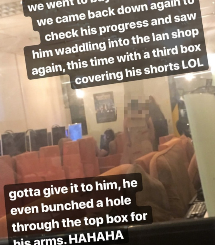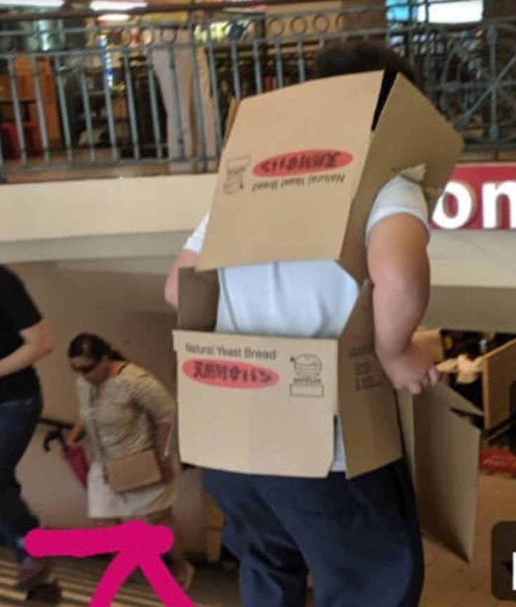 2019年06月07日為了進網咖打遊戲真的是拼了!新加玻一名網友在商場吃午餐的時候,目睹了一名剛放學的男學生「變身紙箱男」一路往網咖的方向走去!由於穿著學生制服是不被允許進入網咖,這名男學生竟然機智想到用紙箱遮蓋制服,表達了他強烈想要進入網咖打遊戲的慾望!