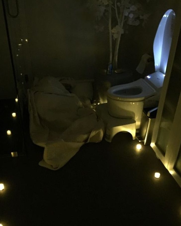 ▼9. 老婆喝太多,在浴室睡著了…但是他沒有不爽,反而鋪床、帶毯子、枕頭、襪子和水等等…