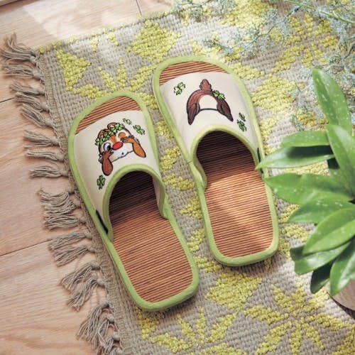▼拖鞋:鞋墊是用竹子做的,穿起來很清涼。鞋子邊緣是綠色的,就像踩在清爽的草地上。拖鞋上的奇奇蒂蒂表情逗趣,充滿童趣。