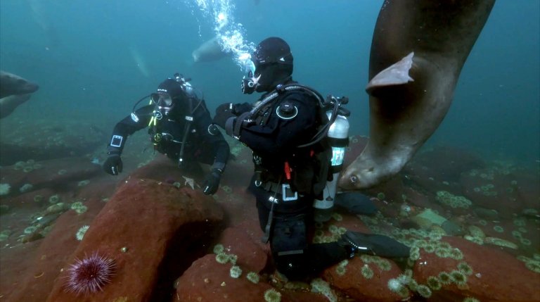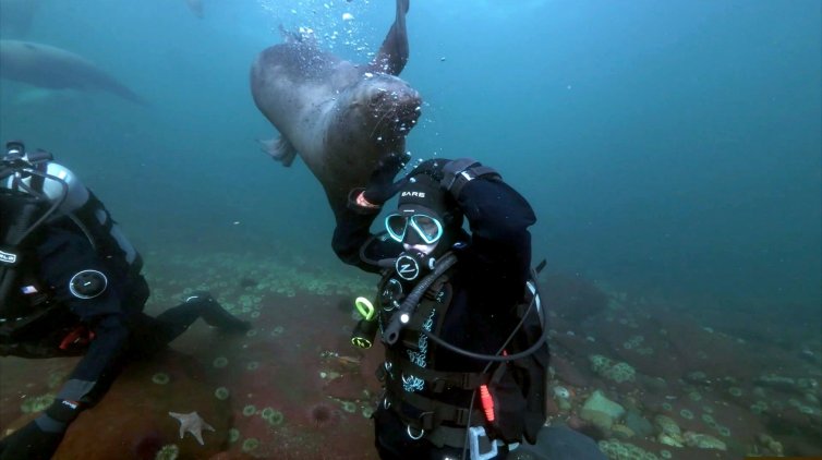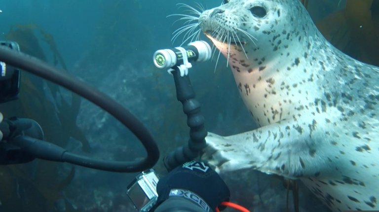 ▼這些海豹和海獅還會輕咬他們的頭、手和腳蹼,在牠們準備離開的時候,牠們露出了超無辜的表情。