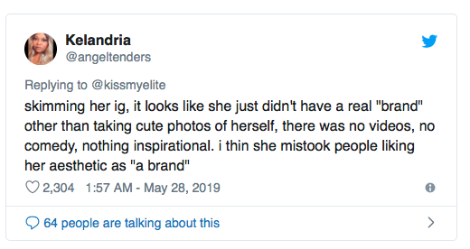 ▼「我正在刷她的IG,看起來她並沒有真正創立一個『品牌』,她只是不停po自己的美照。沒有影片,沒有幽默的話,沒有激勵人心的東西。我覺得她把別人對她的美的喜愛,誤以為是一個『品牌』了。」