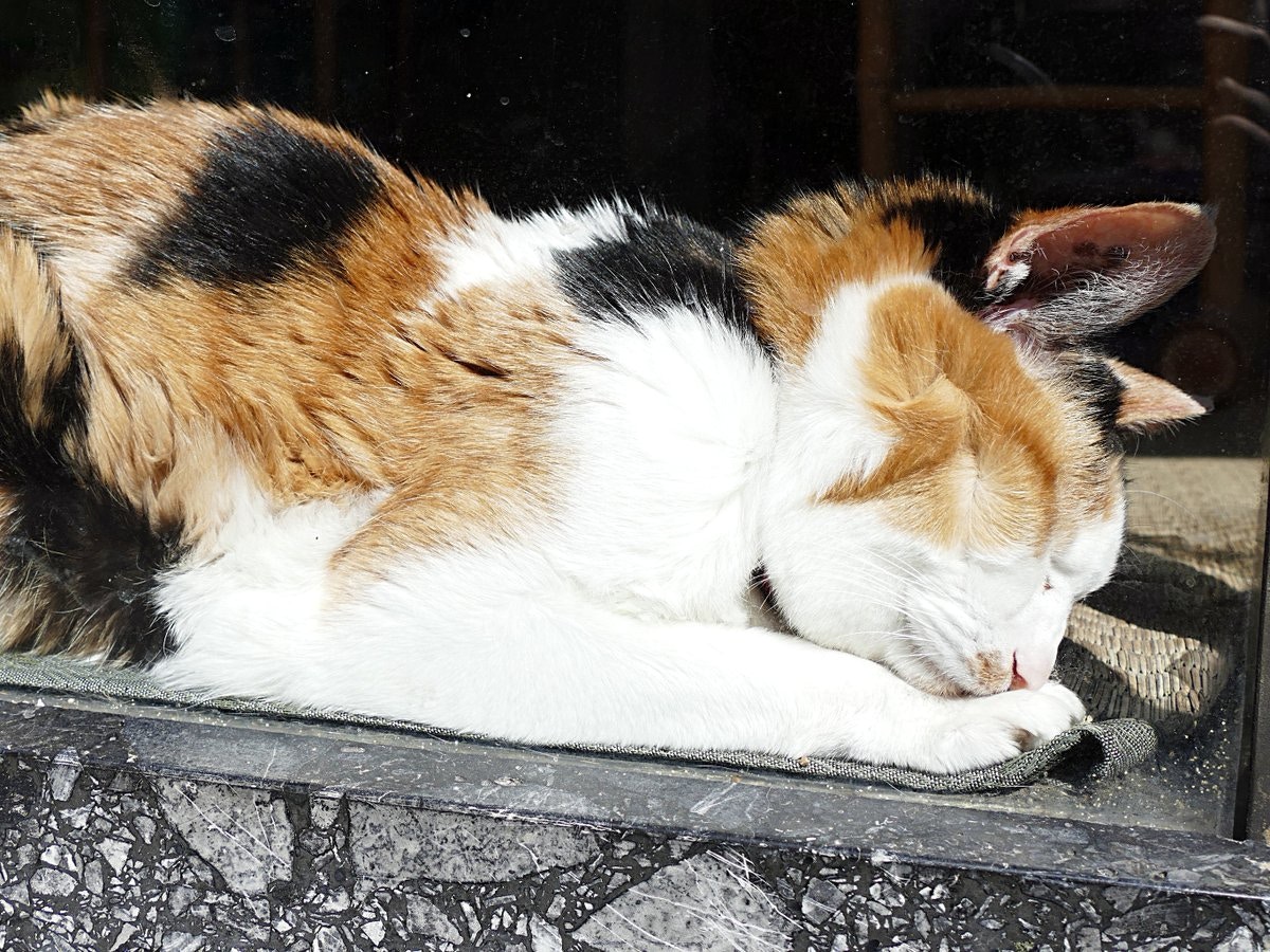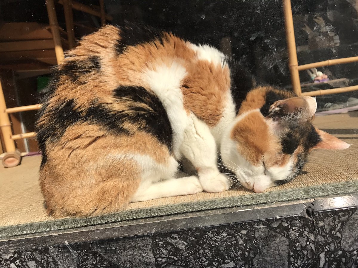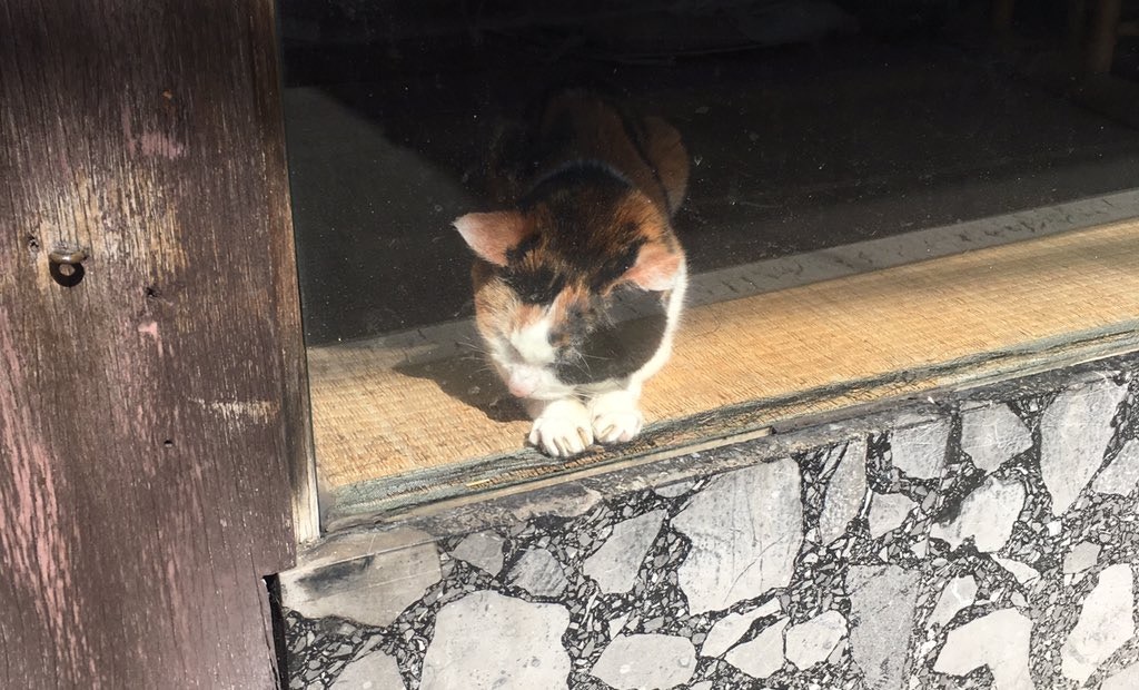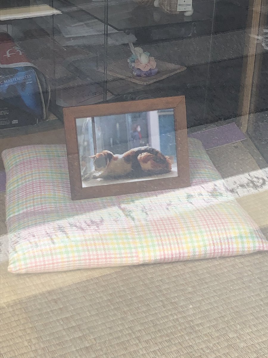 ▼從照片中可以看到,玻璃窗內陽光照耀的地方有一個布團,上面是一張貓咪的照片。這一幕就像貓咪還在享受陽光一樣。伊東宣明表示:「牠曾在這裡,曾被愛過。」