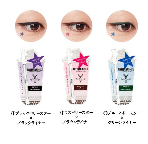 ▼這次的兩款限量彩妝品包含「Stamp Liner眼線筆」以及「Topping Shower眼影」,眼線筆有三種顏色,黑色眼線X黑莓星、咖啡色眼線X覆盆莓星,以及綠色眼線X藍莓星,包裝也很用心,特別設計成珍奶的樣子!