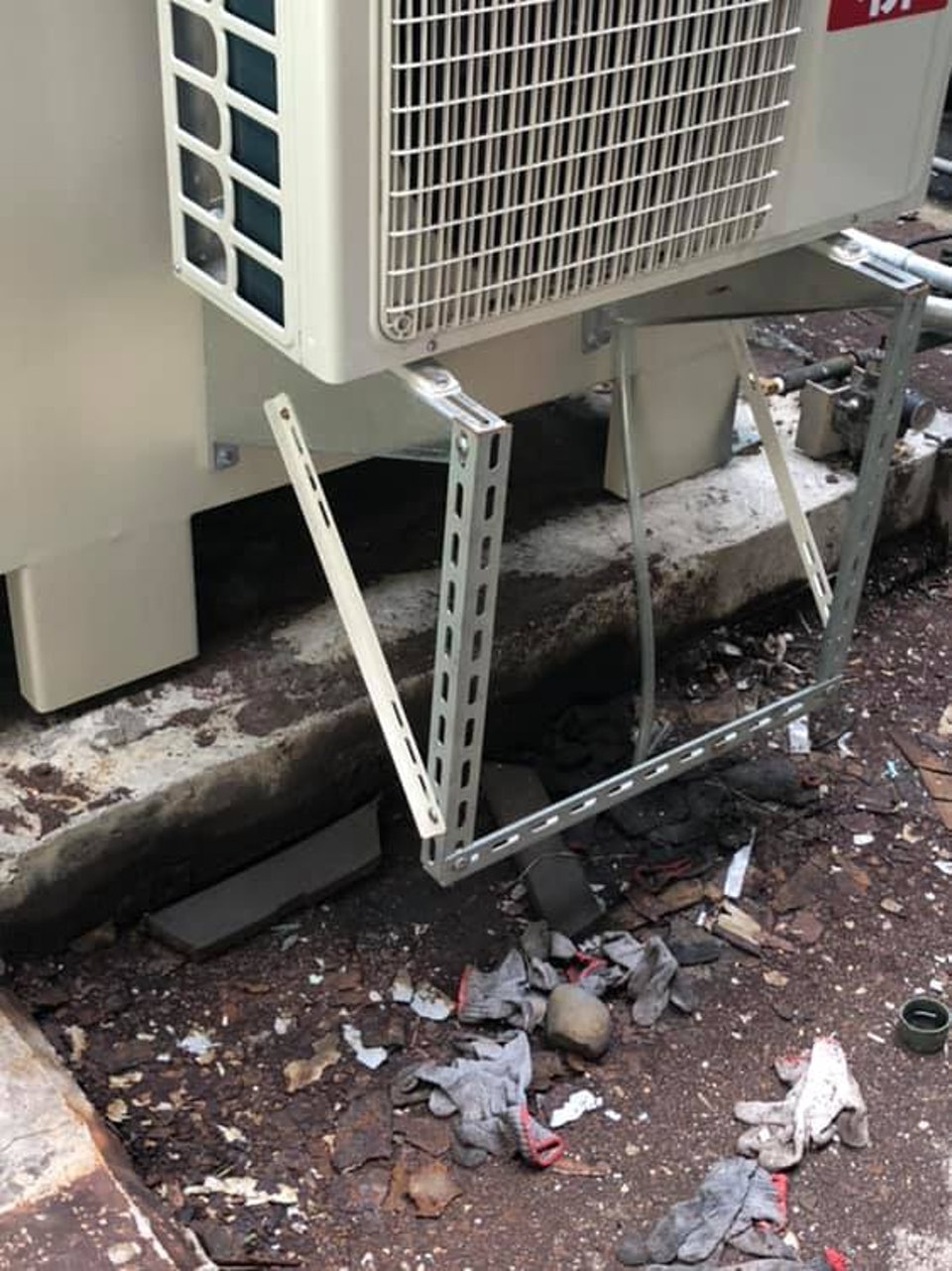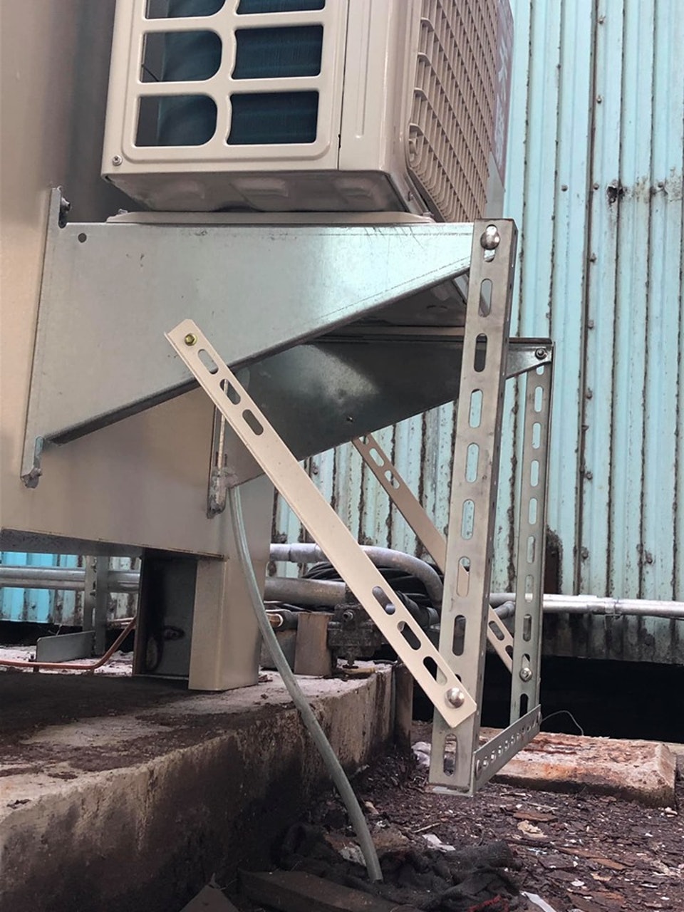▼從網友分享在臉書《爆廢公社二館》當中的照片可以看到,室外機底下的支架竟然是懸空的,讓人不禁好奇如果原本就打算懸空,那幹嘛還要裝上支架呢?