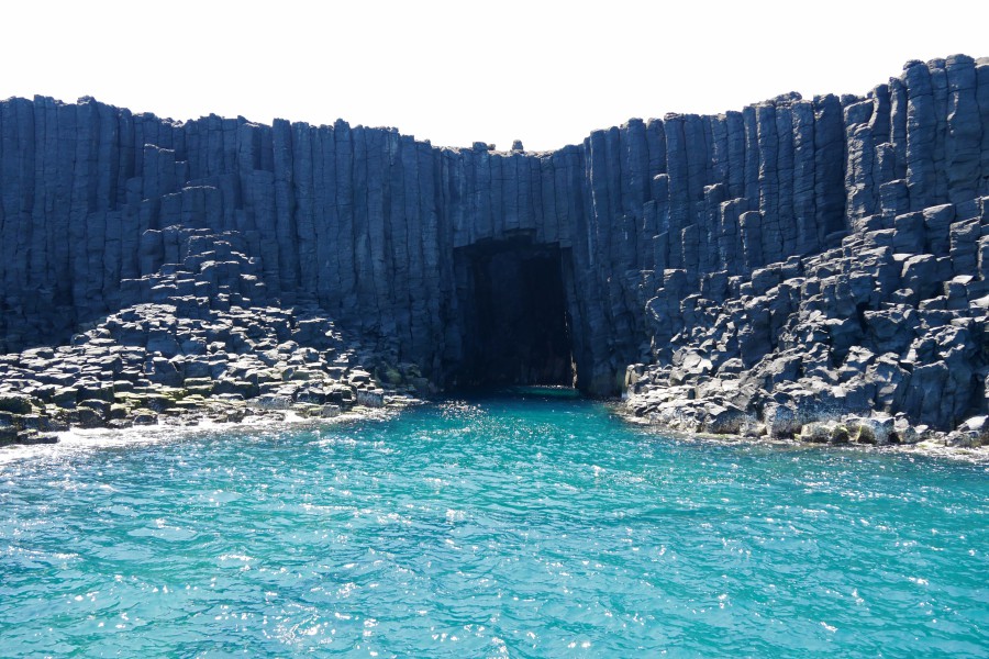▼5.「藍洞」黑色的柱狀玄武岩搭配湛藍海水,因海蝕洞頂端坍塌,形成這座美麗的澎湖景點,藍洞距離馬公有一段距離,通常要請當地人帶領才能到達!