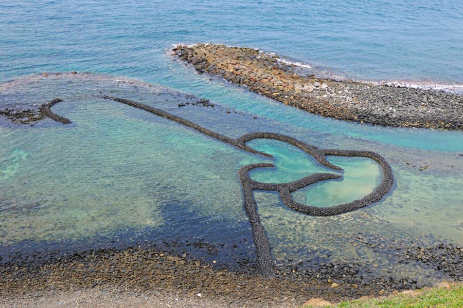 ▼3.「雙心石滬」常常在學校課本看到,來到澎湖當然不能看看本尊的模樣啦!雙心石滬為在澎湖縣七美鄉東北角,在東湖村頂隙北面的海崖下。清澈湛藍的海水以及造型完美的兩個愛心,是澎湖最浪漫的景點!