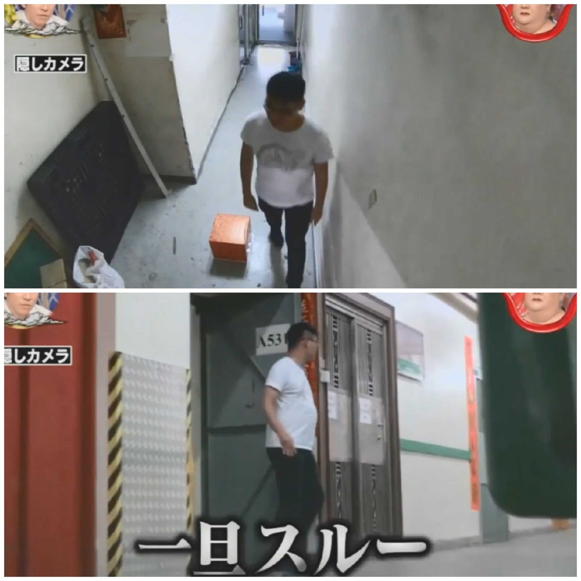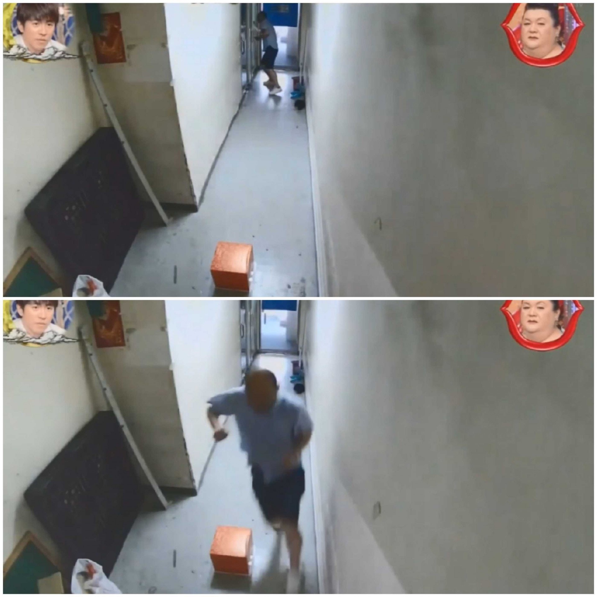▼男生果然注意到了走廊上的盒子,他非常疑惑,到處張望。
