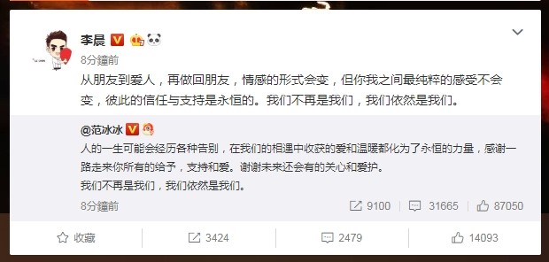 ▼李晨迅速分享,並表示:「從朋友到愛人,再做回朋友,情感的形式會變,但你我之間最純粹的感受不會變,彼此的信任與支持是永恒的。我們不再是我們,我們依然是我們。」