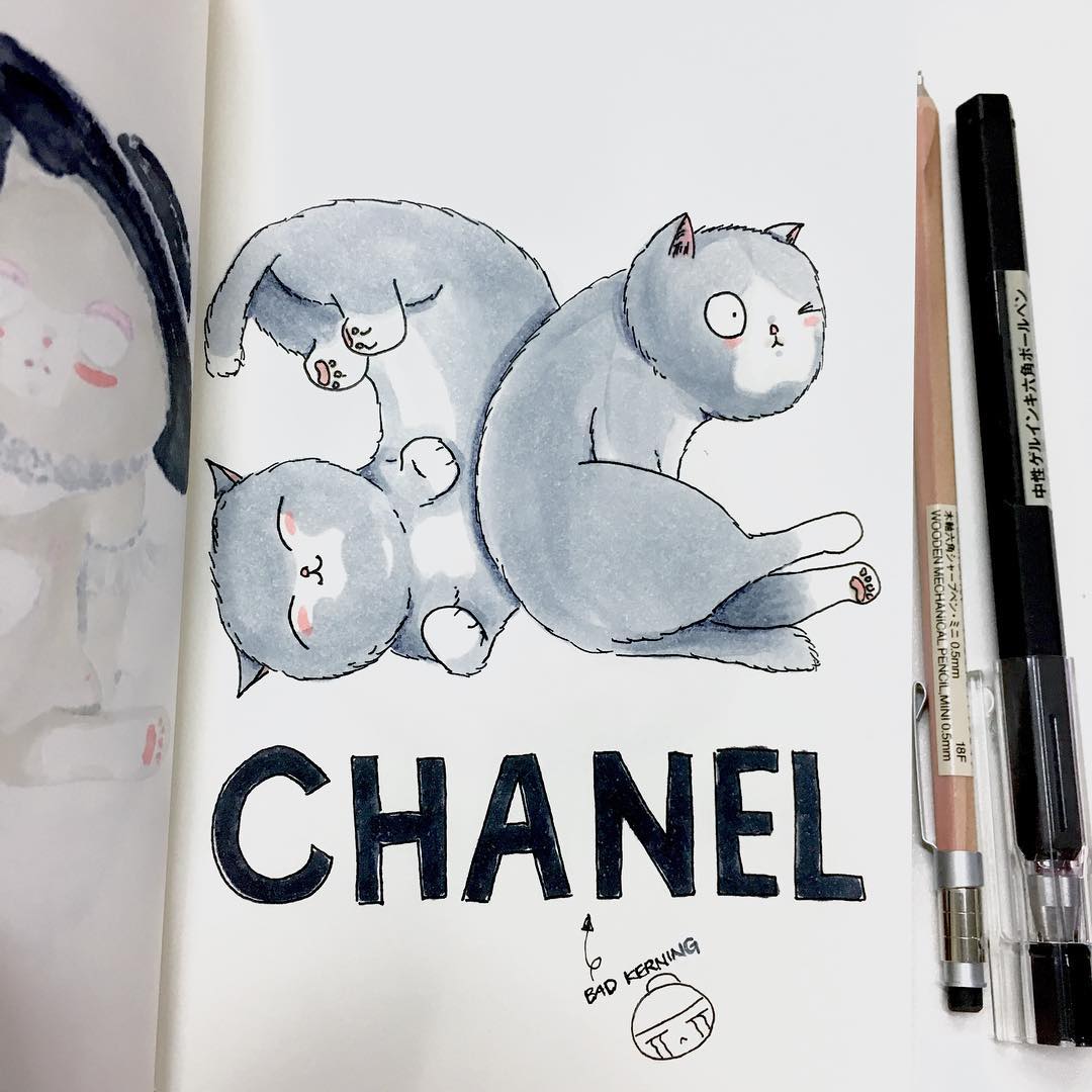 貓咪化的LOGO太萌了。原本高冷的香奈兒LOGO,變成了兩隻可愛的貓咪,突然覺得這個品牌更親和了。大家如果喜歡這些貓咪化的LOGO,可以追蹤一下這位插畫家的Instagram。