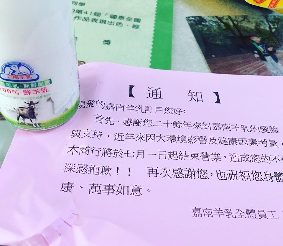 2019年06月29日過去為了顧及學童營養,很多家長會在早上訂購「嘉南羊乳」,是很多人從小喝到大的回憶。不過最近卻有花蓮網丟到通知單,宣告嘉南羊乳即將停止營業,讓許多人哀嚎:「我的童年回憶!」