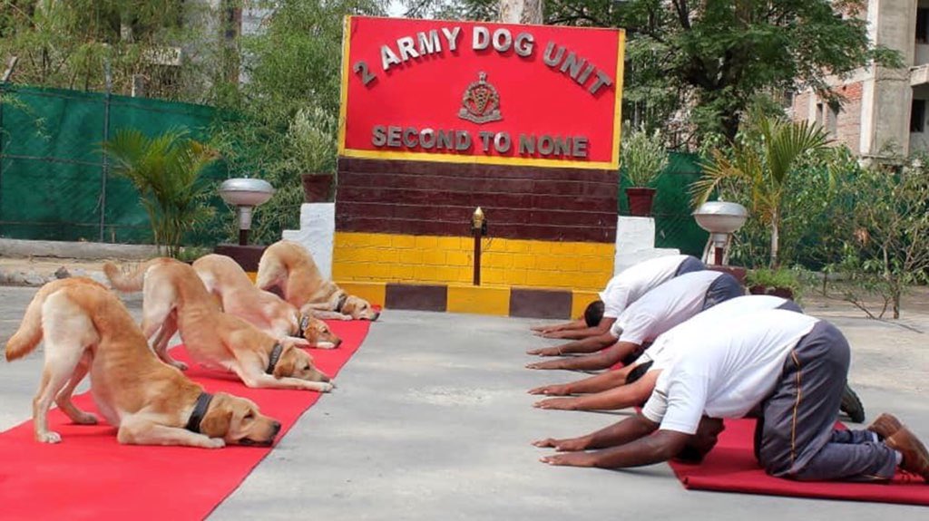▼網友在推特上分享了兩張拍攝於印度陸軍犬部隊(Indian Army Dog Unit)所拍攝的照片,可以看到狗狗們跟著人類,展現了自己對於瑜伽的熱情。