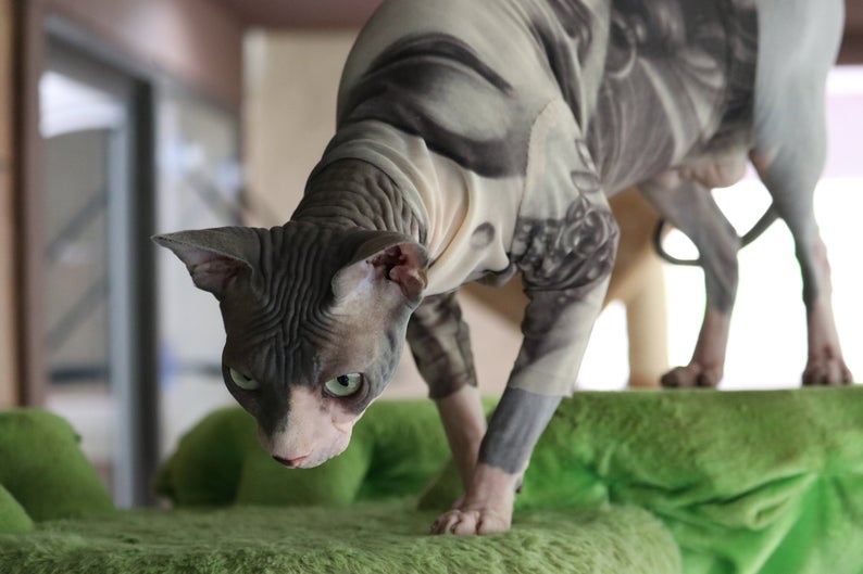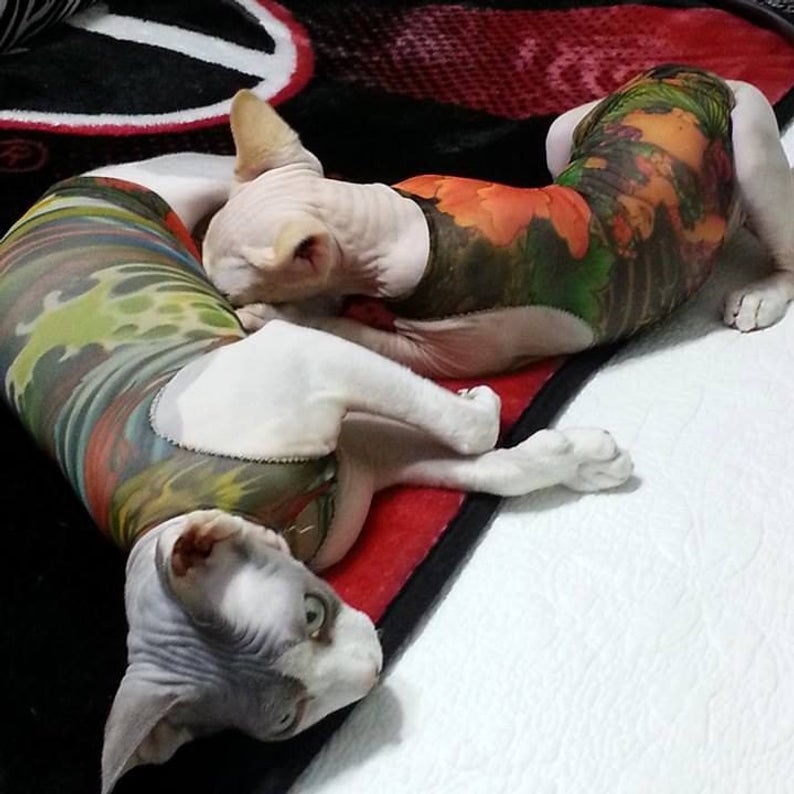 無毛貓的皮膚非常敏感,主人真正愛牠們的話,就不會給牠們刺青,讓牠們受苦。如果主人是刺青愛好者,可以給家中的無毛貓買Airie設計的這款衣服,效果也是一樣的~