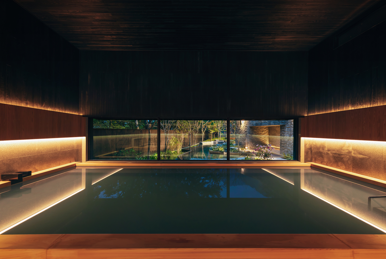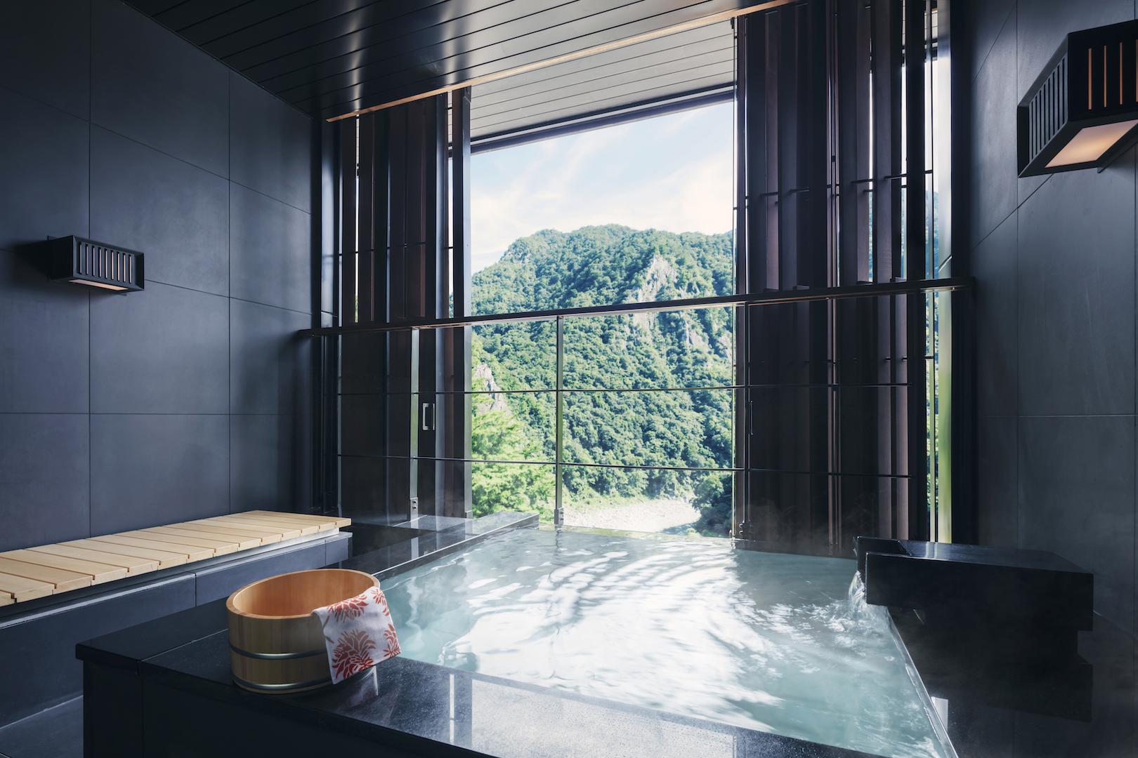 ▼「虹夕諾雅 谷關」中的公共設施多以溫泉與湧泉水為主軸,大浴場中分為室內、露天兩種溫泉,室內溫泉依日式溫泉概念打造,而露天溫泉則獨特設計出開放而舒適的空間,讓人身心都投入谷關當地自然環境。