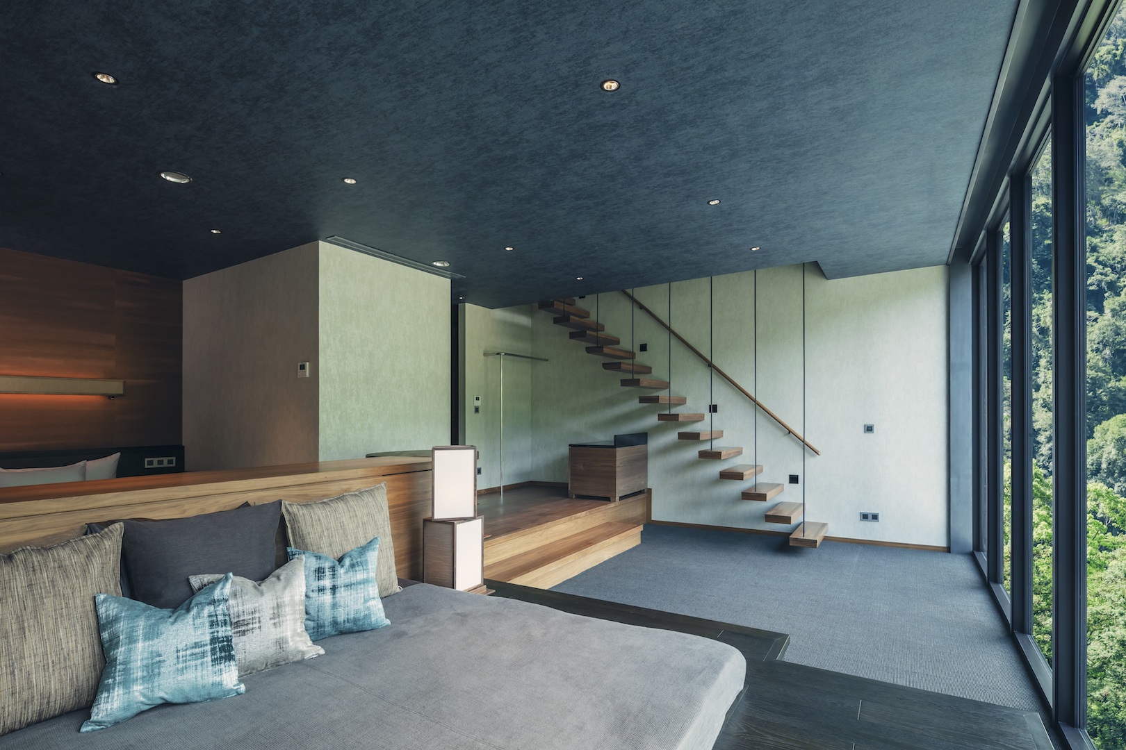 ▼幾乎所有客房都是樓中樓房型,客廳及寢室的樓層中設有寬大的落地窗,從窗戶向外望去便是一整片賞心悅目的自然風光,景色隨時間推移,無論四季、早晚,都各自有一番風情,十分美麗。
