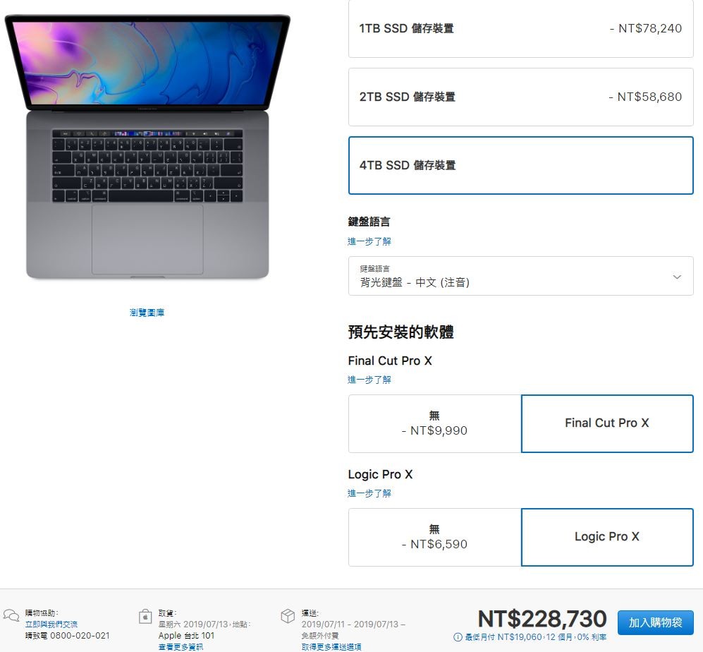 ▼有網友測試將處理器、記憶體、SSD硬碟等硬體都選擇升級至頂級,再加購了蘋果可供選擇的專業軟體如Radeon Pro Vega 20繪圖處理(1萬1410元)、影片剪輯軟體 Final Cut Pro X(9900元)、音樂軟體 Logic pro X(6590元),最後的價格竟然來到了驚人的22萬8730元!