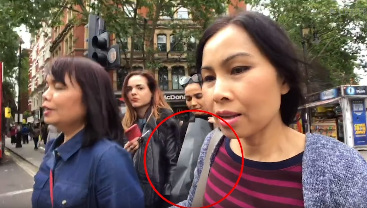 ▼從影片中可以看到,這兩名泰國女子來到了英國倫敦皇宮戲院,正在等待人行道的交通燈準備過馬路,不過其實她們早已被扒手集團給鎖定了。