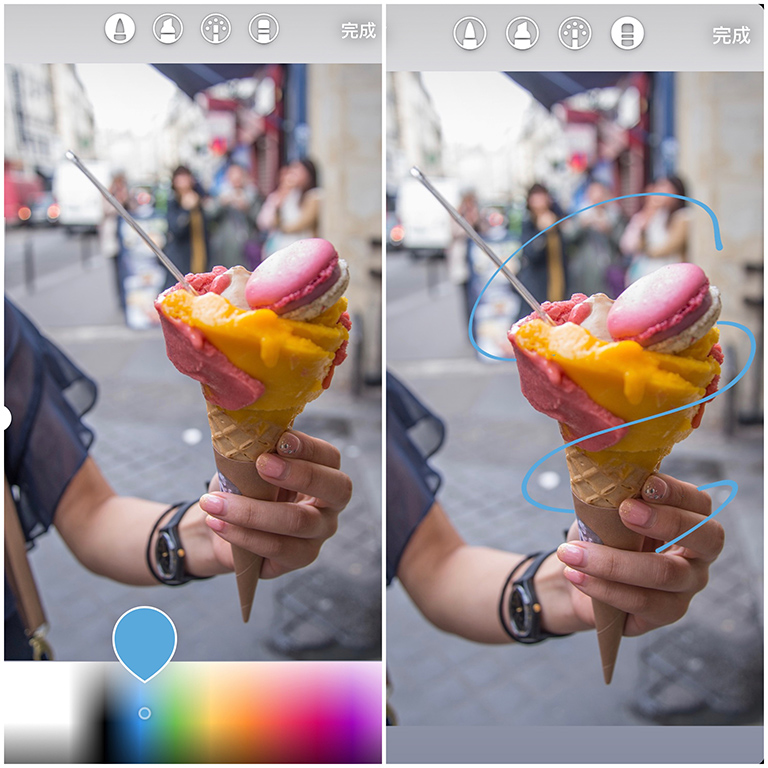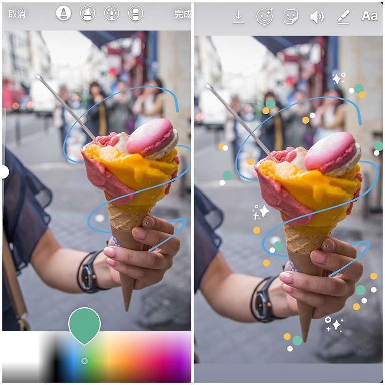 ▼想要做出夢幻霓虹圍繞的效果,只要利用IG限時動態內建的畫筆,動動手指就能完成囉!第一步先選好照片,點選現限時動態的畫筆功能,選擇閃亮魔法棒後將筆刷調細,對著照片中的主角隨意的畫圈圈。