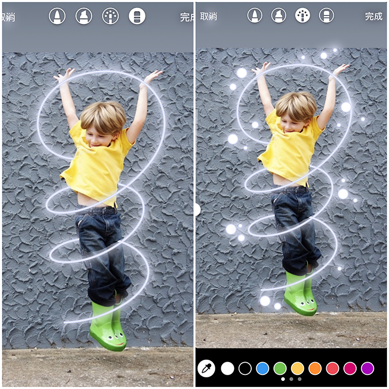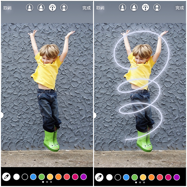 ▼如果不喜歡霓虹燈的感覺,也可以試試看用一般筆刷,可以呈現出可愛插畫的效果!首先點進限時動態的一般筆刷功能,調整適當粗細和顏色之後,一樣隨意的畫圈圈;接著用橡皮擦,將多餘的線條擦掉~