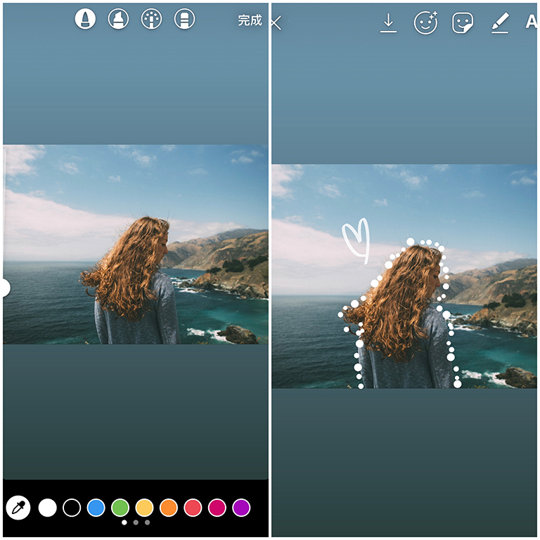 ▼接下來就可以選擇自己喜歡的顏色和不同的筆刷大小,在線條周圍畫上點上可愛的圓點點,最後再用GIF功能,找一些適合的素材放上去,就完成可愛插畫風的限時動態啦!