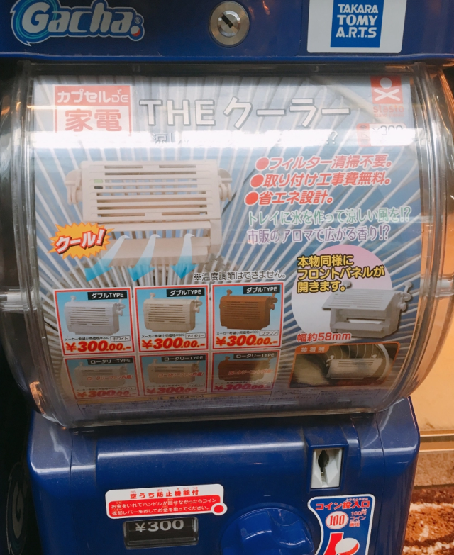 ▼空調扭蛋機只要300日圓(約台幣86元)就能玩一次,裡面的玩具空調分為6種不同的顏色。不過顏色不重要,大家關心的是,它真的能製冷嗎?